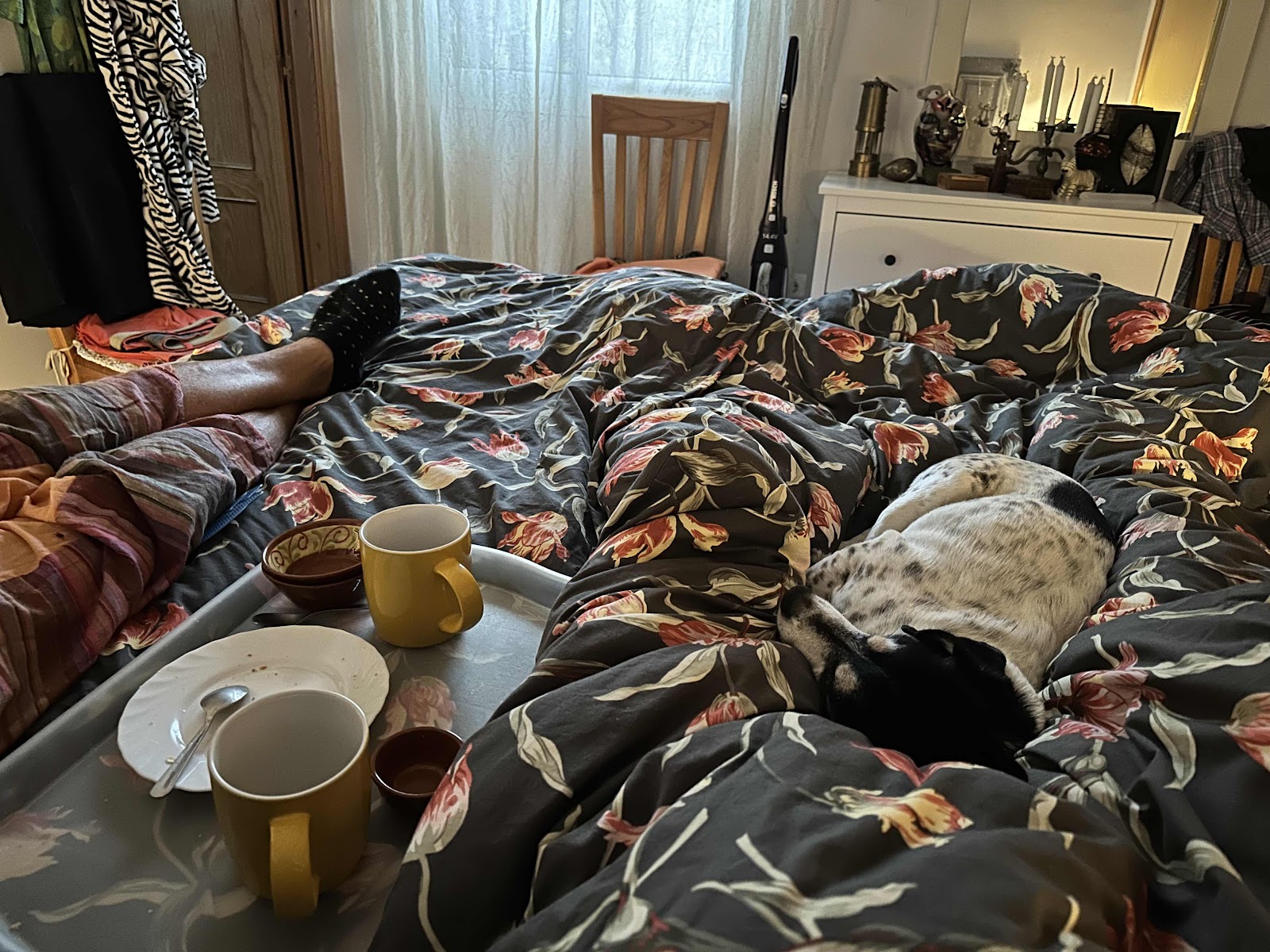 Tillbaka i våra lata morgonvanor. Frukostbrickan mellan oss. Sara mellan benen.