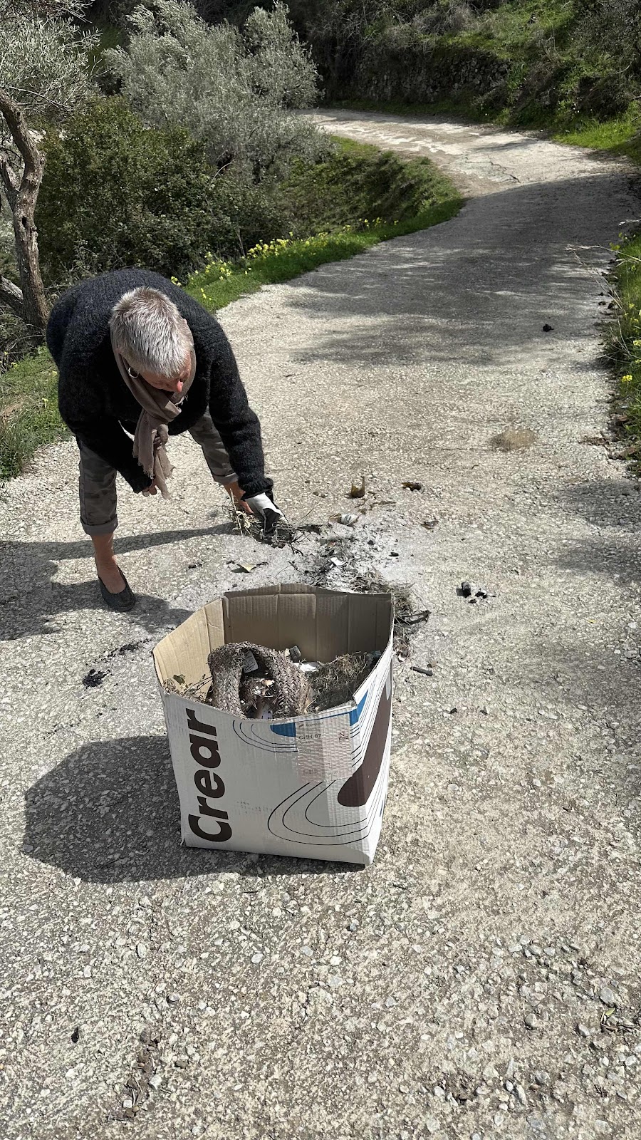 Hur en hel kartong med skräp hamnat utspritt på vår väg vet vi inte. Men bara att ta upp och städa.