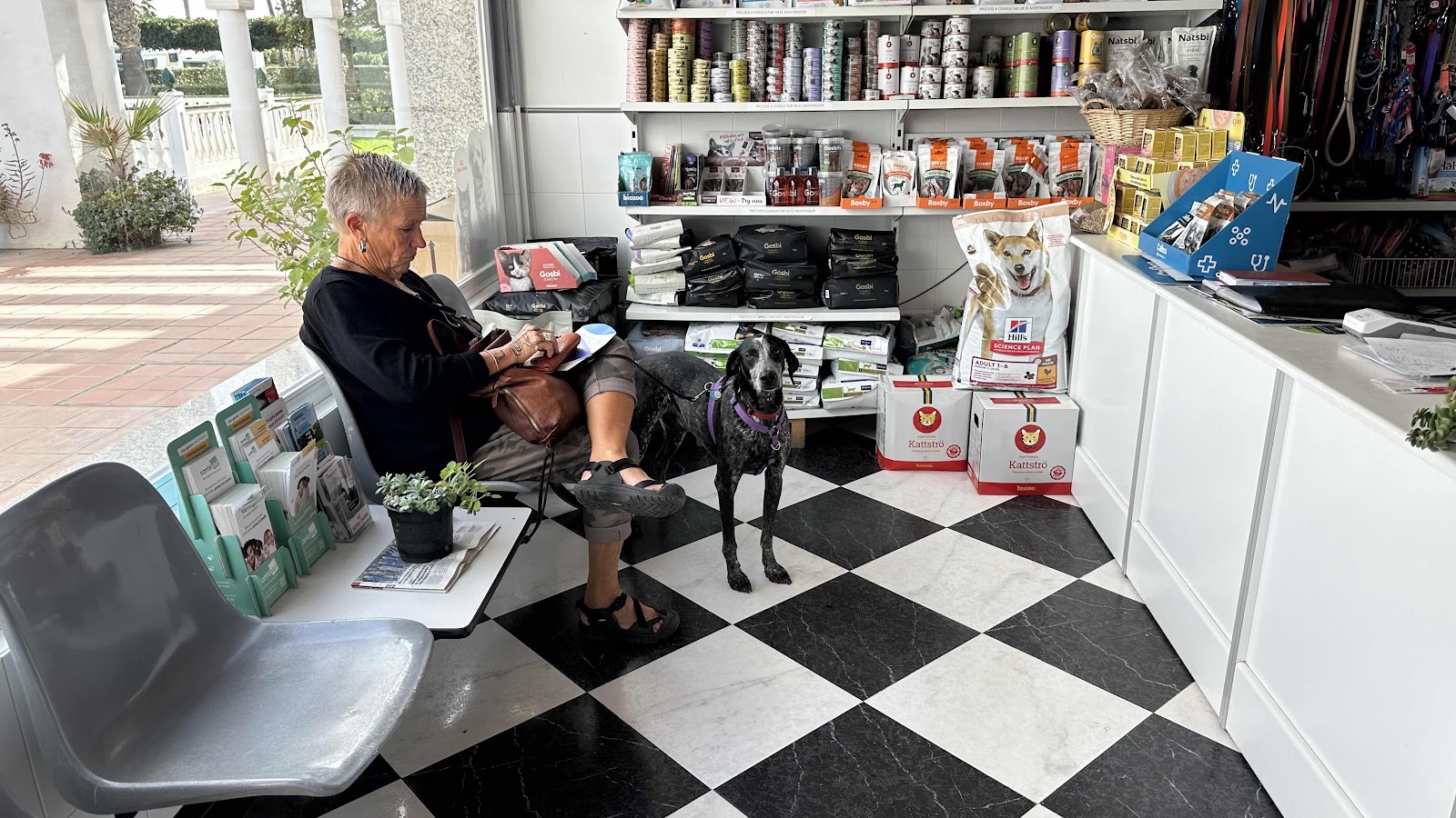 Härligt. Pensionen har kommit. Först Veterinären med Walter. Han har lite bekymmer med ögonen som ofta är röda.