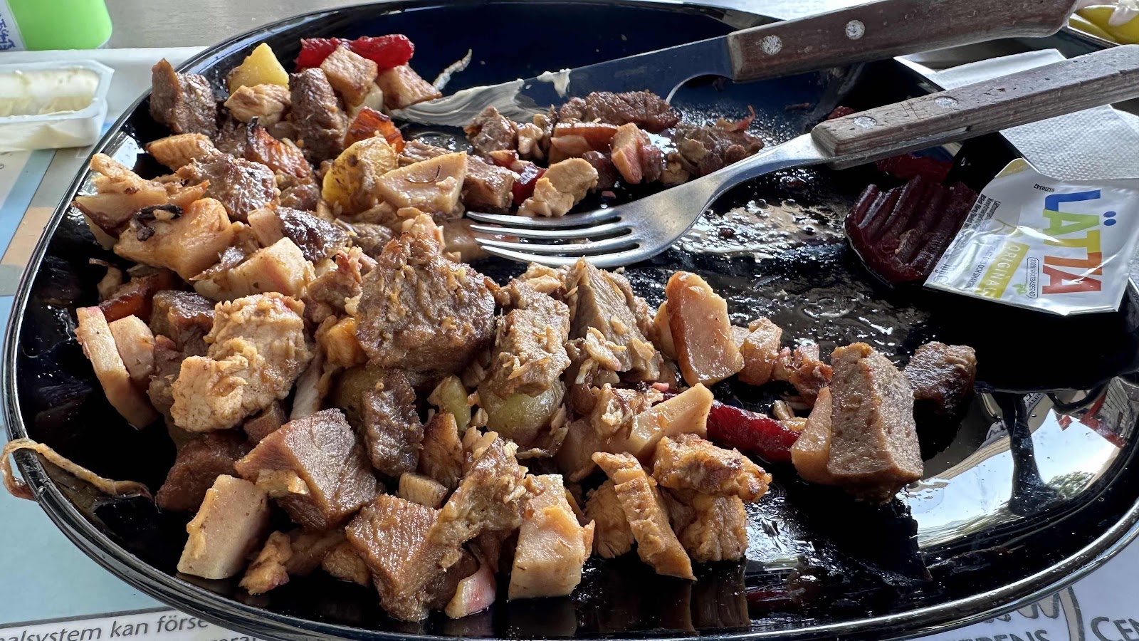 Dagens lunch äts på ”Nillas restaurang”. Tänk att få kalla det restaurang när ingenting är gott och serveras som i ett skolkök. Sorgligt är bara förnamnet. Men finns det inga alternativ så blir det väl så här. Detta föreställer pyttipanna.