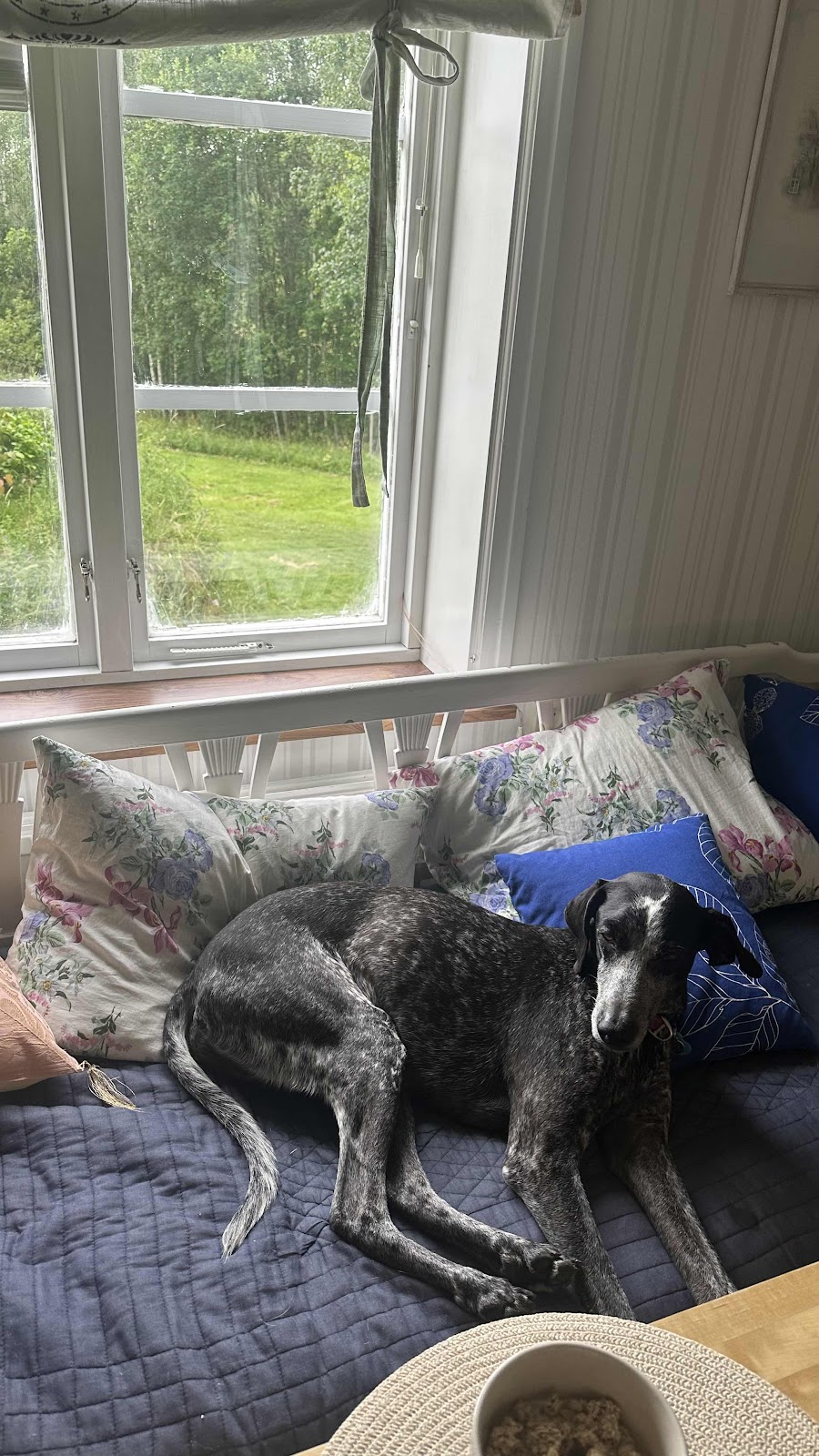 En riktigt trött kille. Han har stått vid fönstret hela natten o spannat efter katten. När Britta kollade tredje gången kl 4 så låg han med huvet över ryggstödet på soffan. Då började det visst vara tungt.