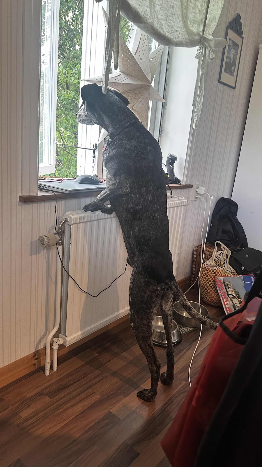 Walter håller sig gärna nära oss. Vi gissar att hemma i Casa BriOla är huset/gården tryggheten. Nu är det vi som står för den.