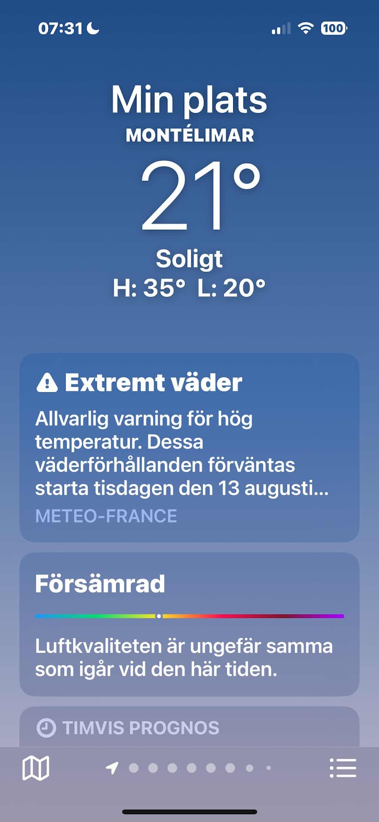 Kollade vädret på morgonen. Varning för värme.