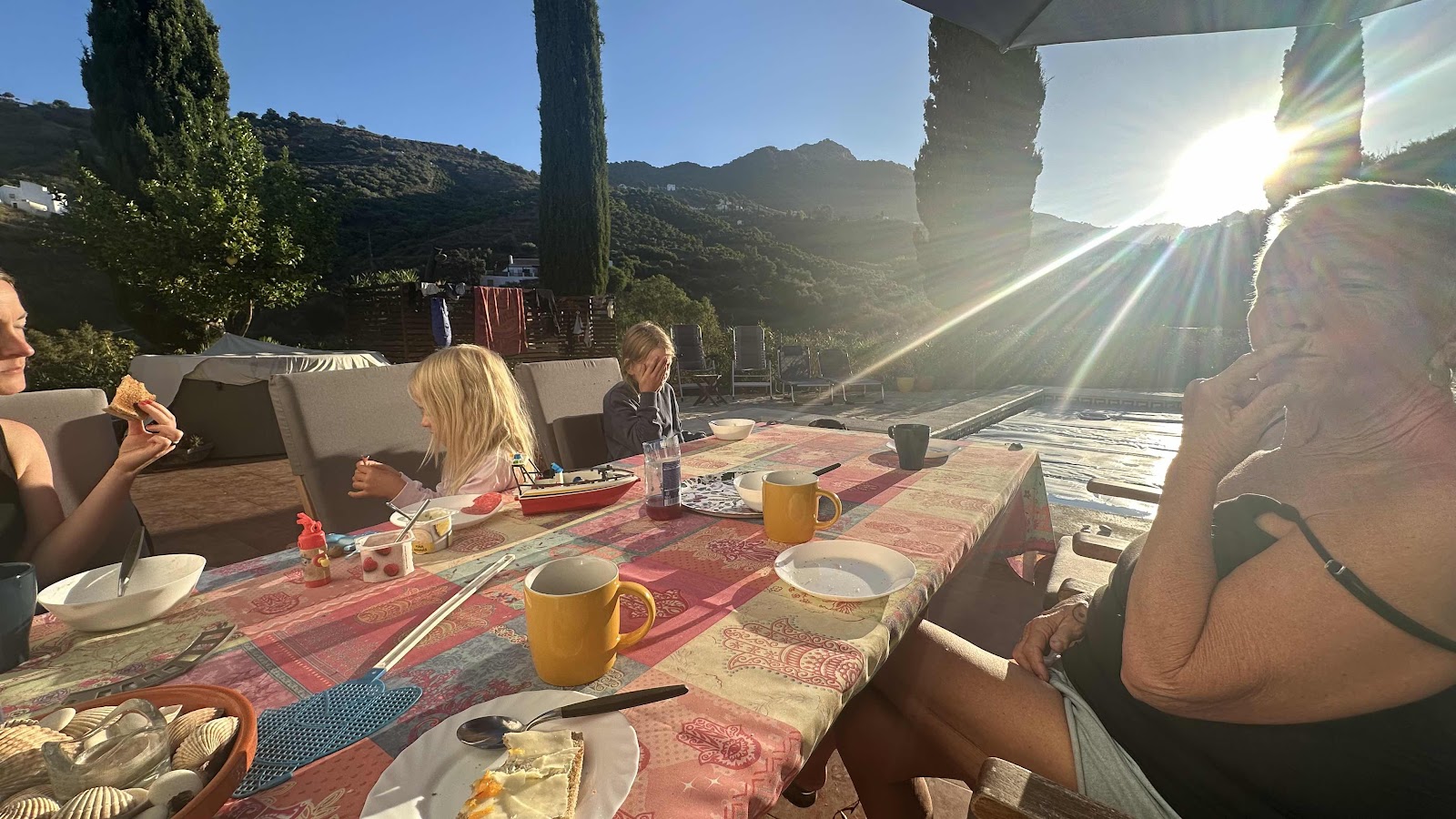 Mysig morgonfrukost med alla tillsammans. Går att sitta i solen en liten stund på morgonen.