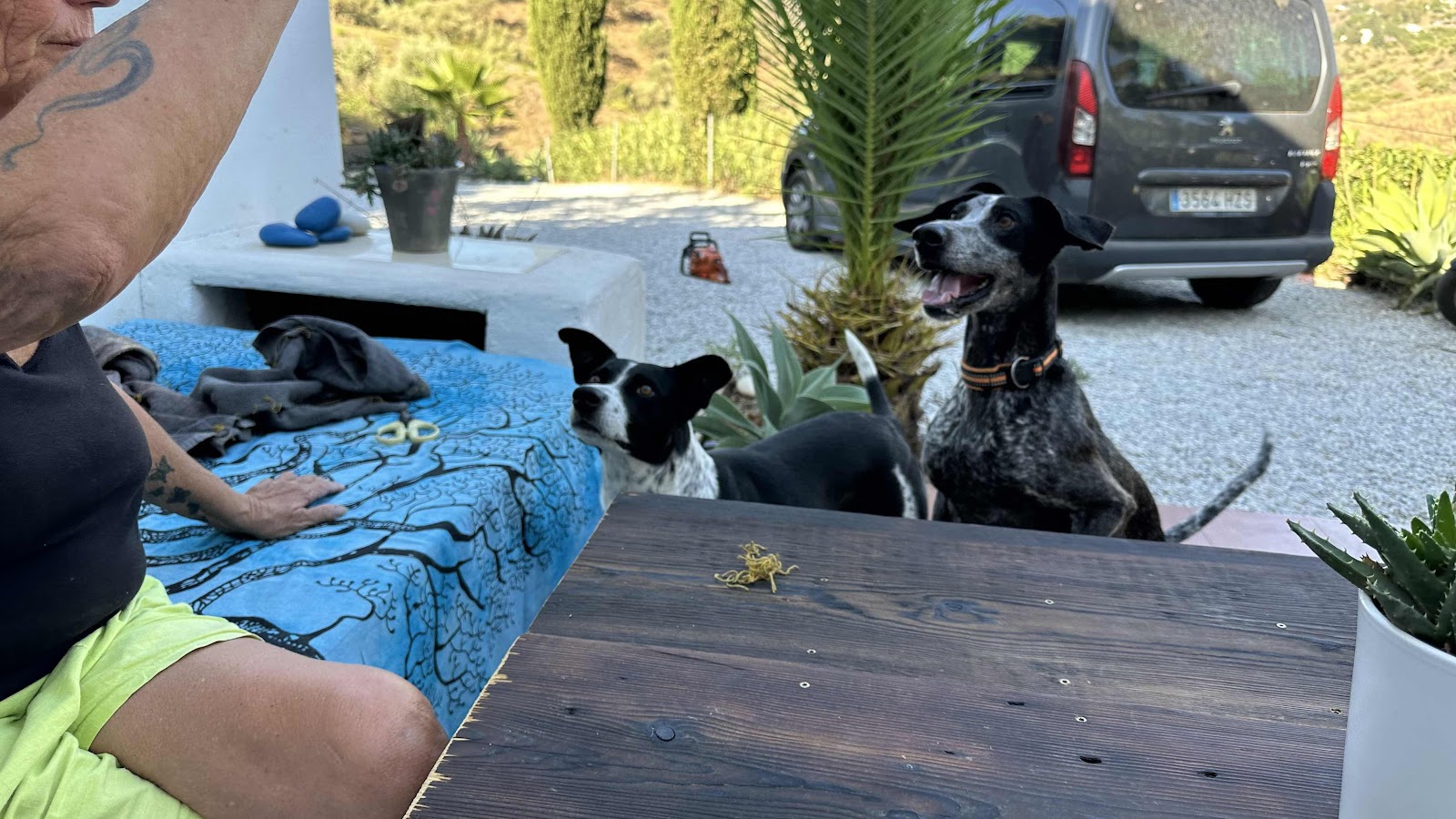 Sen lite trädgallring uppe i en krona när ändå traktorn var igång. Blev samtidigt premiär för Britta att köra traktorn. Här har vi fått besök av en vandrare med två hundar.