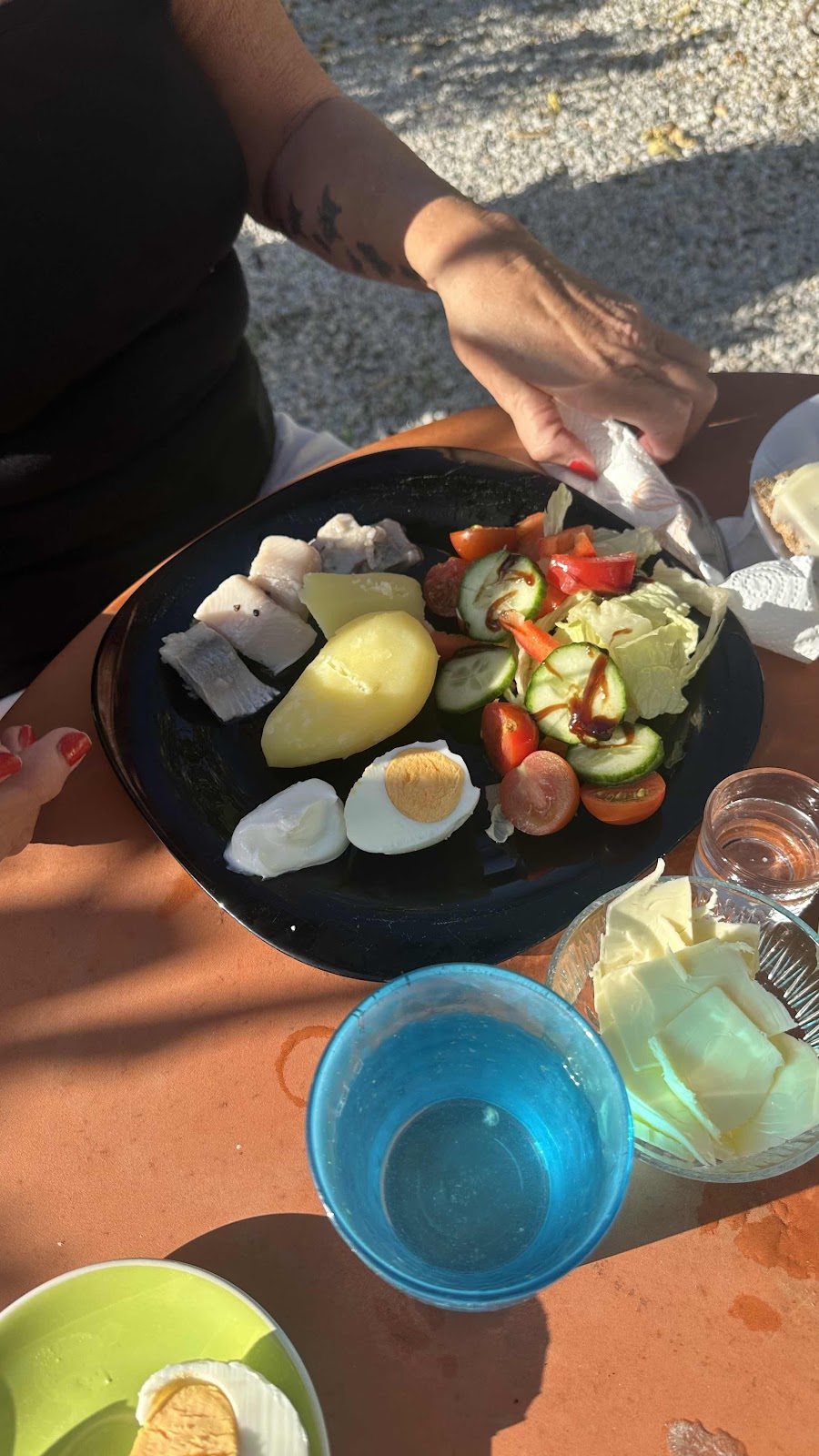 December här med. Vi blev sugna på lite sill. Alltså käkade vi sill o kokt popatis. Å vi satt såklart ute i solskenet
