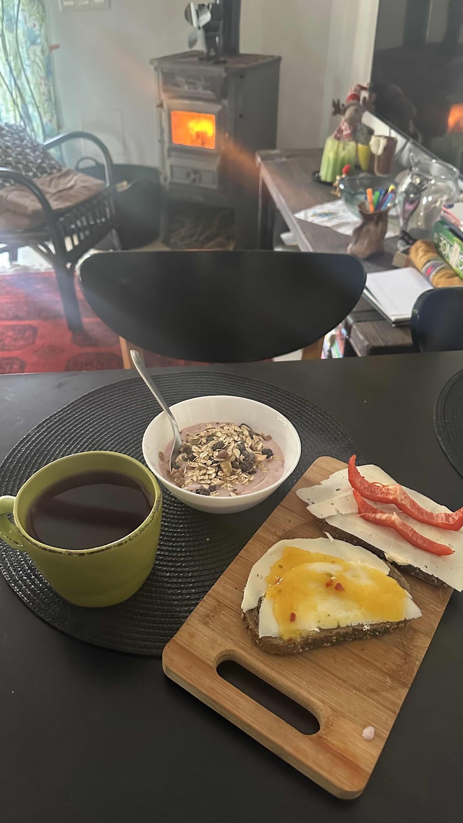 Kallt i morse med. Brasfrukost.