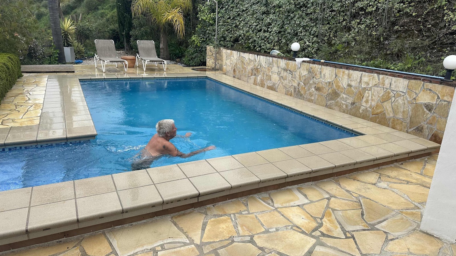 Oh NEJ. Bara för Brittmarie. Hon är en hårding. Eftersom vår bassäng är tom så lånar hon David o Lonas.