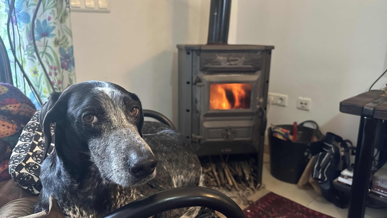 Vi får tända i kaminen det första vi gör. Annars blir det rått o otrevligt. Men vi är duktiga på att ella. Walter är snabb att paxa kaminfotöljen.