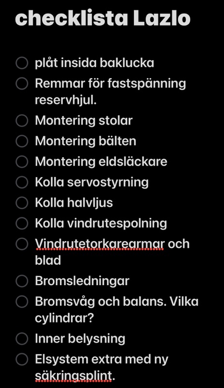Nu blir det sova här innan det blir av hem mot Spanien. Ser verkligen fram emot det även om det varit otroligt kul att få se hur Lazlo blir en fin bil igen. Tror inte många förstår hur enormt mycket jobb det är att plocka ihop en gammal rallybil. Man letar begagnade grejor som sen måste modifieras och snyggas till innan de kan monteras. Det är liksom inte bara att skruva dit grejor.