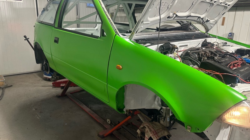 Skärmar o dörrar på plats plus massor av jobb som inte syns. I praktiken går det att sätta hjul på honom o backa ut. Dock utan tillstymmelse till bromsar.