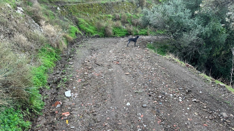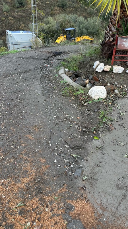 Gick bort för att se hur mitt "vägbygge" klarat sig. Vägbanan är ju oerhört lös nu och känslig för vatten. Dikningen och lutningen hade funkat bättre än väntat. Får snygga till lite och rensa diket lite mer sen när det regnat färdigt.