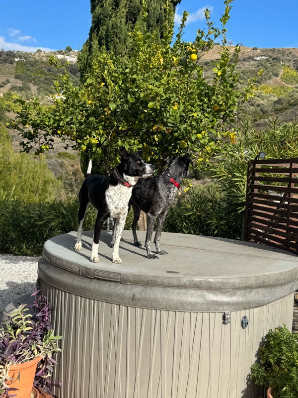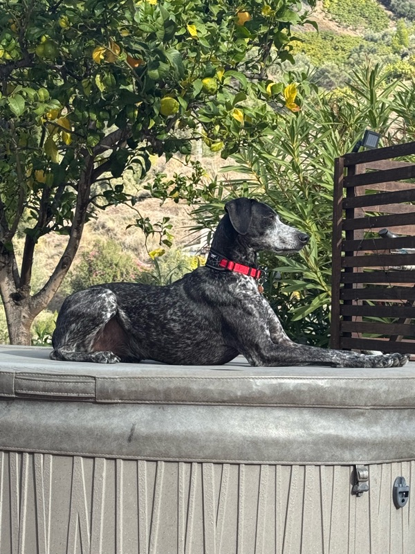 Fina Walter med sitt nya halsband. Han har utegångsförbud av veterinären (utanför vår gård) därför att han har fått nån maginfektion av att ha ätit nåt väldigt olämpligt någonstans i omgivningen.