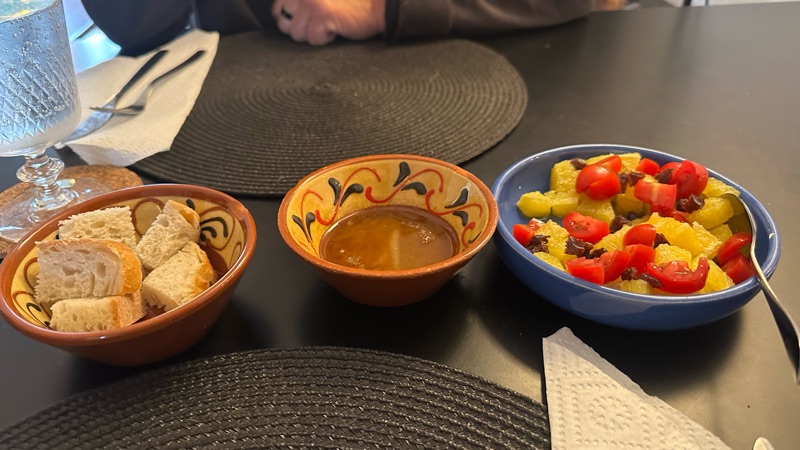 Nyttig brunch. Färskt bröd, nypressad olivolja med salt och blandad frukt.