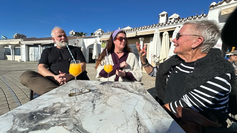 Blev inbjuden till en fika på en solig plaza i Frigiliana. Lugnet innan stormen.