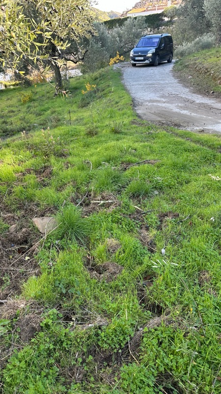 Nu kommer Britta med bilen. Här har grisarna varit och stökat om. Tur vi inte har några gräsmatta.