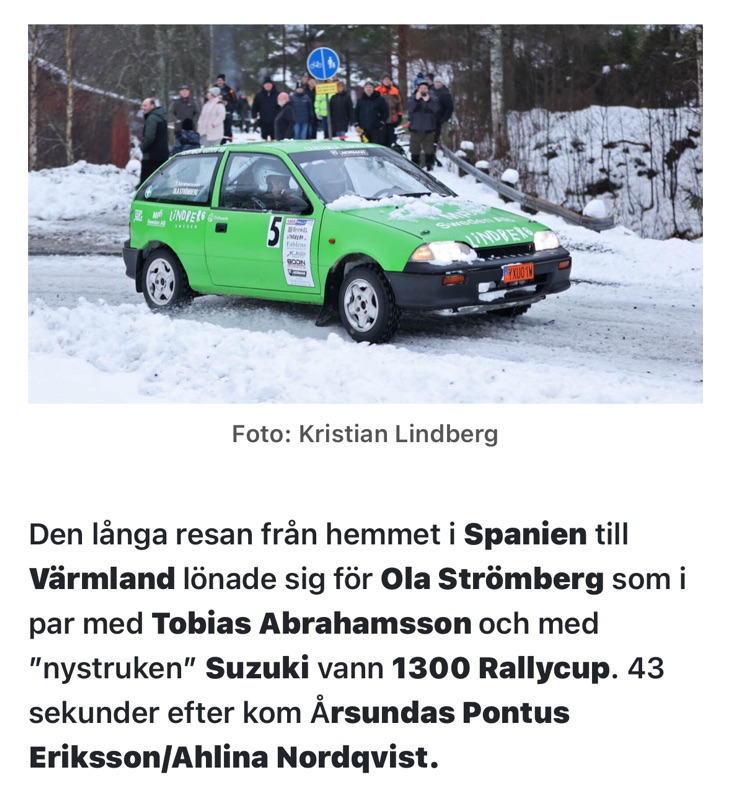 Dök upp en skitglad gubbe i morse på servicen. Ett riktigt SAAB-fan. Han hade foton med sig han ville jag skulle signera. De där klassiska från RAC och Sutton Park 1977. Andra sanna entusiaster ör ju Simon och Lars Nilsson från Jonstorp. De tävlade inte utan servade åt en kompis. Detta blev vårt Waterlo. Efter kilometerlånga rakor med mängder av krön tog vi fel på ett. Svag ingång höger när vi kommer urvarvat på femman på sista sträckan. Vi ville gärna försvara vår andraplats. De va inte svag höger. De var skarp vinkel vänster... Vi hade kommit i otakt på ett av de många krönen. Det blev tvärstopp mot en kronsten fast lite energi rullades bort när vi hamnade på taket. Folk välte rätt oss innan vi kunde kliva ur. En slagen hjälte med blå tunga o en löser tand. Sedan en massa ömma muskler. Britta klarade sig nästan helskinnad tack o lov. Tre timmars väntan i skogen, sen lift in till Herrljunga där jag fick suverän hjälp att plocka ih...