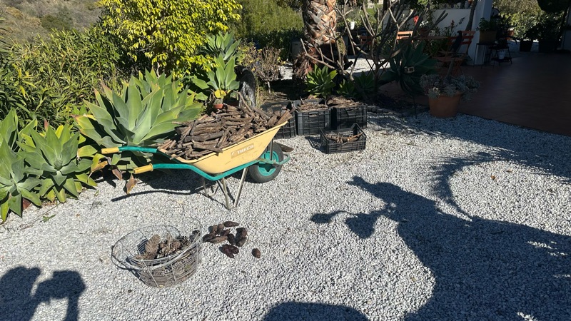 Kärrat upp lite ytfuktig ved som får torka i solen. Det tar på förrådet i denna ovanliga kyla.