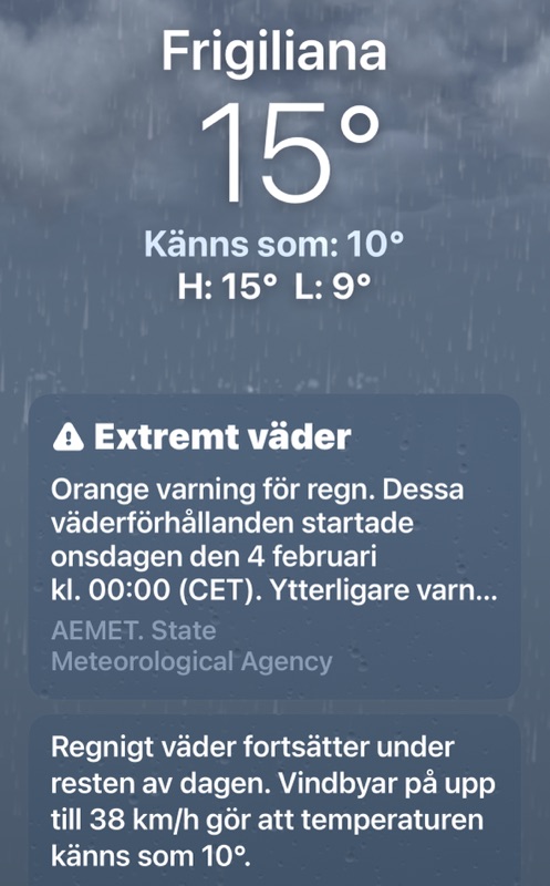Så här kan vintern i Spanien te sig. Vi har ändå klarat oss bra. Bara gul varning här. Faktiskt slutade det blåsa vid middagstid och regnade ganska normalt. Till och med så bra att Britta vågade sig ut med bilen och ta med sig Marie till Velez-Malagas stora köpcenter.