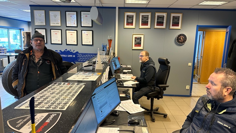 Sen tillbaka till Centrala gummi för att få på nya vinter på Doris. De gamla såg bra ut och slitbanan men det fanns självsprickor och slitbanan hade börjat separerat. Det vill man inte vara med om på en långresa upp till Sveg. I Kundmottagningen stötte jag på Stefan Bella Bergin Förutom personalen Ola Larsson och Stefan Sollenfelt. Suverän service som vanligt och så fick jag förstahandsinformation om att Centrala Gummi AB numera ingår i Däckia koncernen.