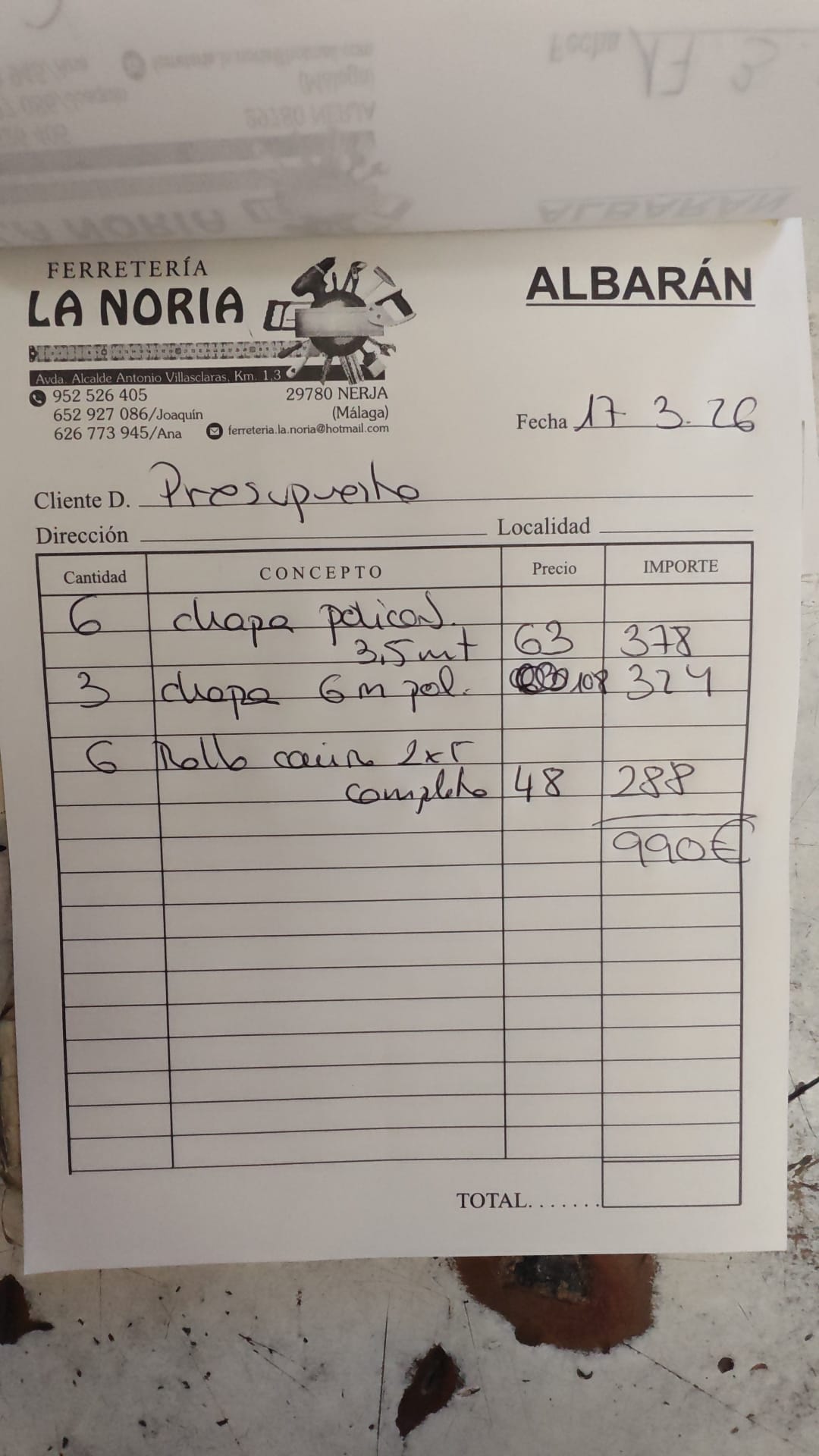 Först posten i Torrox. Britta fick sina saxar. Sen Nerja för att göra ärenden och handla. Skulle passa på att tanka lågpris. De va konor ivägen! Stängt. Rysk soppa? slut? När handlade åkte jag till La Noria, järnhandeln. De hade allt jag behövde. Men hur få hem sexmeters korrugerade glasfiberskivor (nytt tak på pation)?