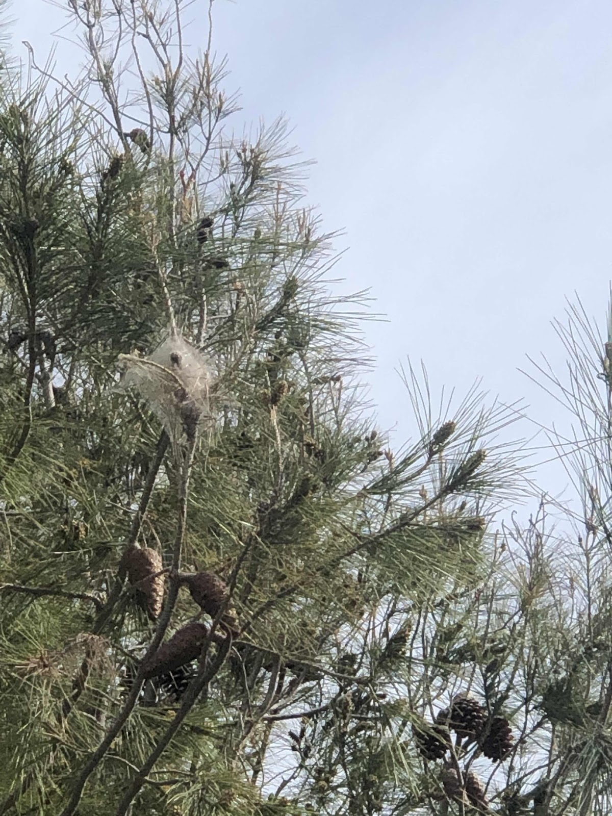 De där luddiga högt uppe i vårt pinjeträd som skuggar banan är ett bo för Processionslarver. När de är klara o lämnar sitt bo bildar de meterlånga kedjor genom att bita varandra i rumpan. Rör man dem då mår man inte alls bra. Hundar riskerar dö!! 😳