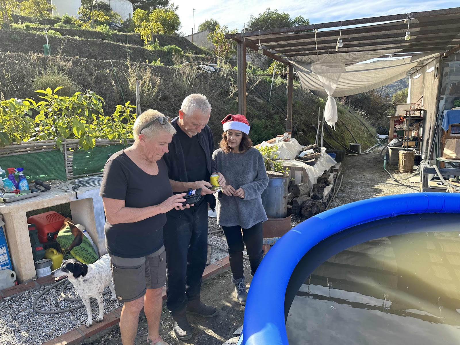 Här visar de stolt inredningen i deras container. Miquel har fixat allt själv.