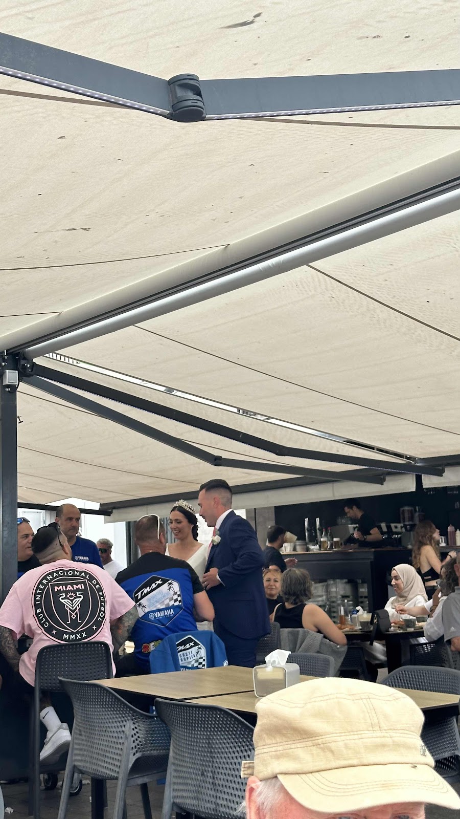 Coolt när brudparet kom in på baren för att morsa på kompisar.