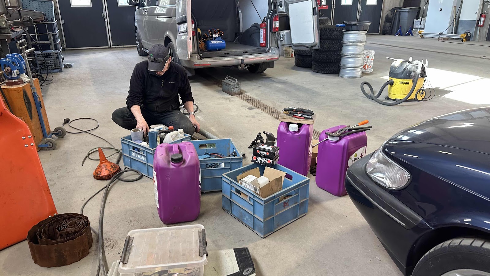 Göran Söderström plockar ihop lite reservdelar som ska med i bussen. Sover hos honom i natt. I morgon blir det lite provkörning. 💤🛌