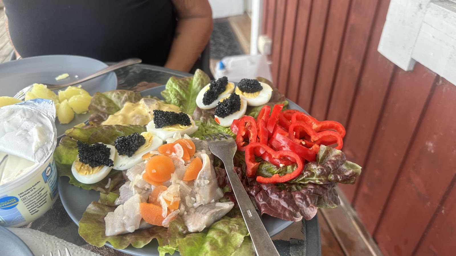 Britta bjöd på midsommarmat. Satt fint efter en lång o varm dag. Sallad från Janssons o ägg från TegelSpjut smaka extra gott.