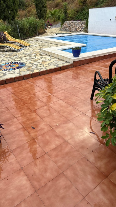 Poolen tömd. Nu bara rengöring. Britta har sovit bra och har nu sluppit dräneringen från magen via näsan. Måste dock stanna ett par dagar till. Bättre en dag för mycket än en för lite. Poolen rengjord och redo för renovering. Tankning och Lunch vid BP macken. Sen vidare till Malaga och JCB för att hämta några prylar. Tänk att detta är ett industriområde. Där sitter det tanter med nätstrumpor på trottoarerna och jobbar. Den här jobbar nog på kontor för hon har en bekväm kontorsstol att sitta i. 😁 På väg tillbaka imponeras man sv de höga bergen vi har här inåt landet. Halvvägs hemma passerar vi Vélez-Málaga. Självklart var ett besök hos Britta planerat. Hade med mig lite småprylar som hon behövde. Hon var ute o gick när jag kom. Hon ska stanna för observation ett par dagar till så man är hundra på att såret i magen har läkt. Magsäcken har ju varit öppnad å jag tror ju att det är jättenoga det läker rätt med tanke på vad som finns i den. Så skönt ...