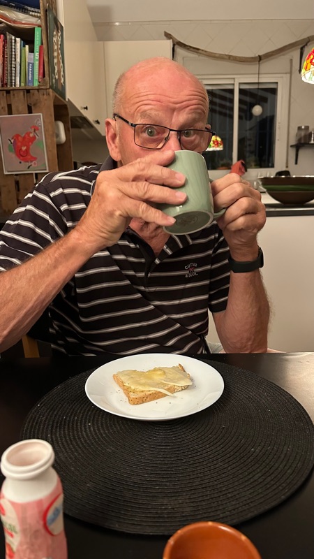 Sen lydde jag kiropraktorns order på att ta en promenad innan jag slutade dagen. Dagen har gått helt utan lunch förutom Brittas två smörgåsar. Jag fick med mig till flyget. Ja och sen den där bullen förstås. Men jag behövde inte lägga mig på fastande mage. Figge fixade en macka och ett kokt ägg. Det räcker utmärkt idag.