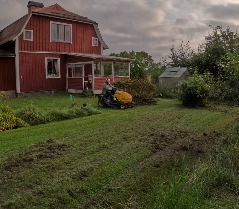 Själv passade han på att klippa gräset trots blötan. Han ska ju snart nog bort på semester 😎