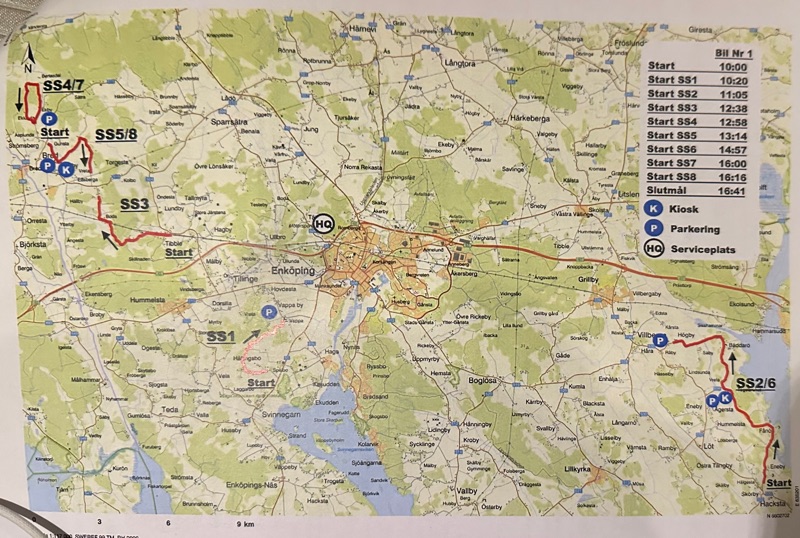 Rallylördag i Enköping. Det var ju detta jag åkte till Sverige för. Fyra mil SS och tjugo totalt fördelat på hela åtta sträckor.