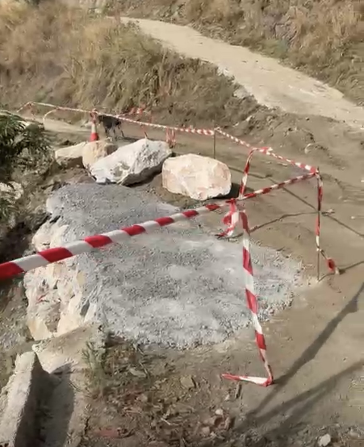 Man börjar med att fylla med stenbumlingar. Jag tror de kan detta. Bara de nu inte missar det andra raset. för då kan vi iallafall inte få ner någon lastbil med till exempel byggmaterial.