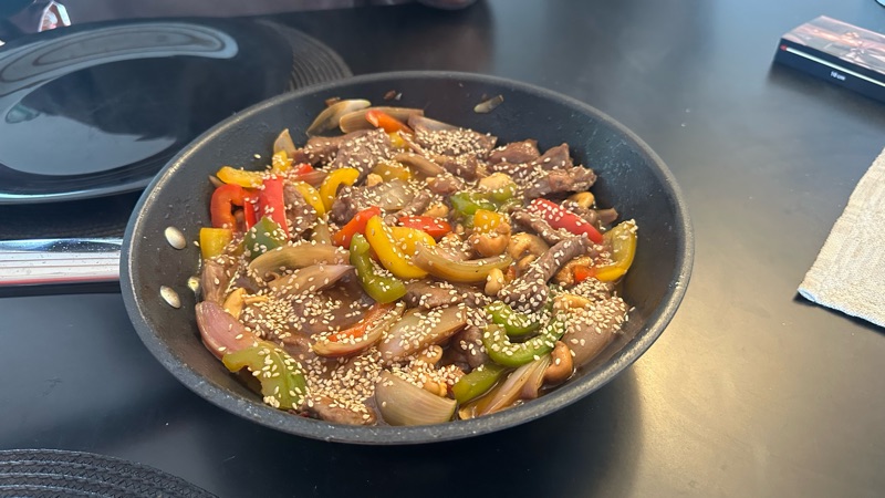 Britta lagade sin favvo lunch. Lite asiatiskt stuk. Mycket grönt. Båda nöjda 👍