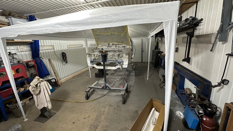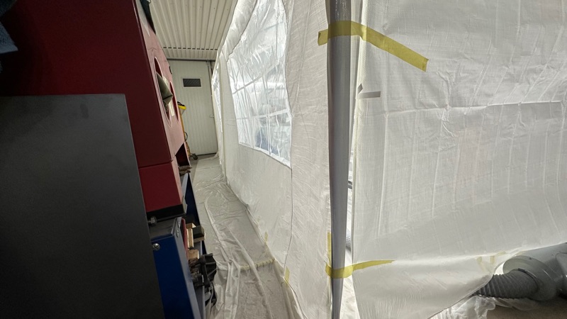 Så har vi byggt ett tält i verkstan så vi kan måla lite. Bäst passa på att snygga till Lazlo när vi ändå håller på.