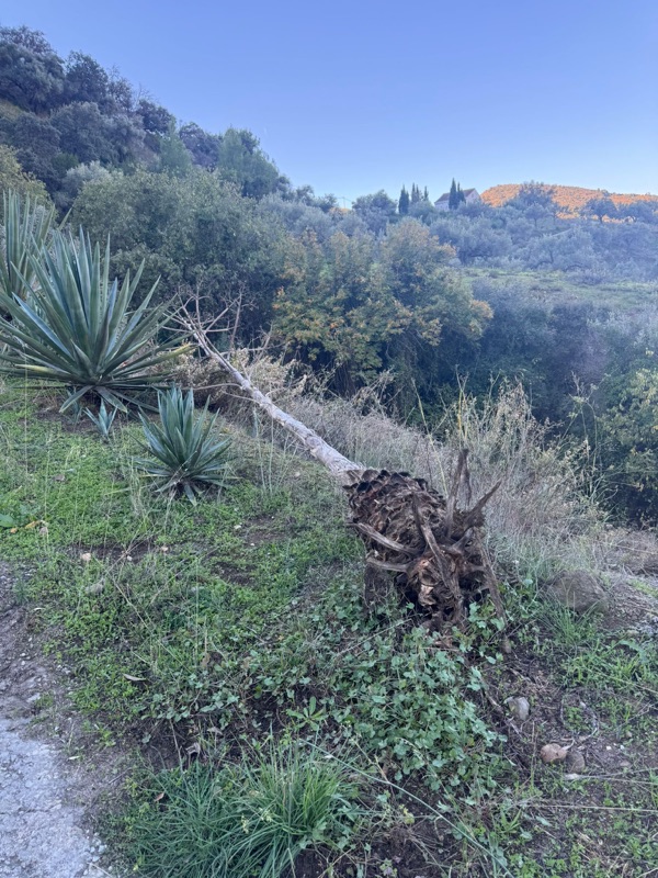 I Casa BriOla har en död palm fått vika för vinden. Blir kanske lite ved av den.